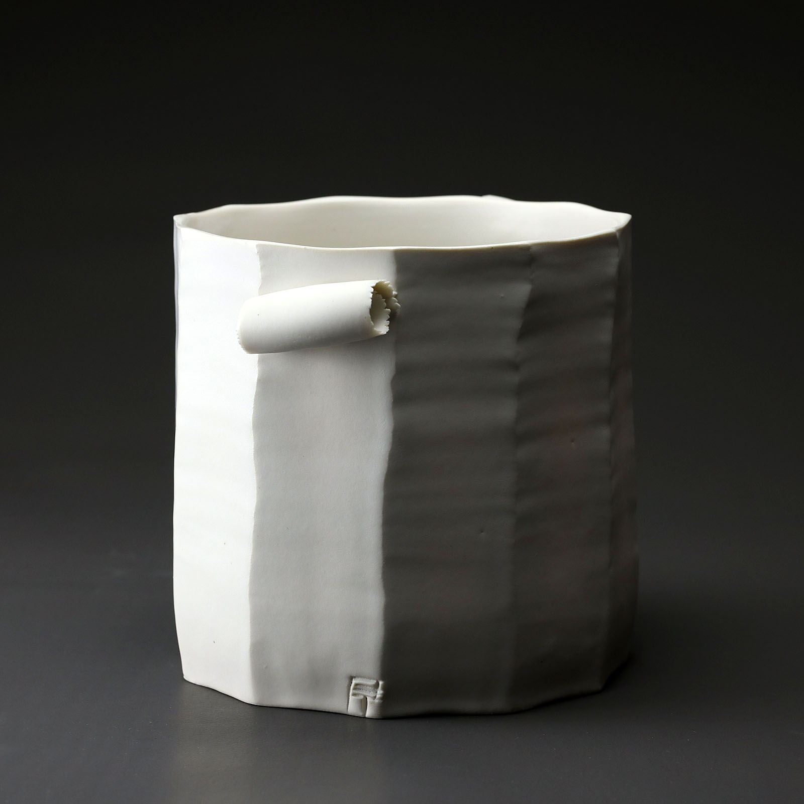 This pot is a unique piece. It is shaped by hand on a potter’s wheel, sculpted to form the facets, then modeled to adorn it with two small handles. It is made of porcelain, glazed in satin white and fired at high temperature. The veneers can be extremely thin and reveal the translucency of the porcelain. The result is a play of light, shadow and transparency.